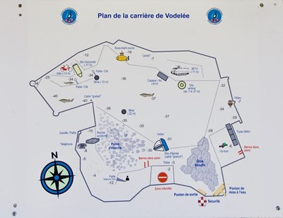 Ensuite, la carrière est faite de plateaux à des profondeurs de -22m, -26m, -36m, -40m, -43m et -52m avec des parois abruptes.Des vestiaires chauffés femmes et hommes sont à disposition.